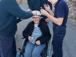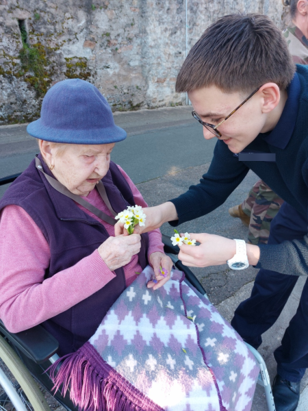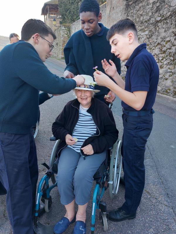 Au fil du chemin, les jeunes ont cueilli des primevères pour offrir et décorer les chapeaux des résidents, ajoutant une touche colorée et printanière à cette sortie intergénérationnelle.