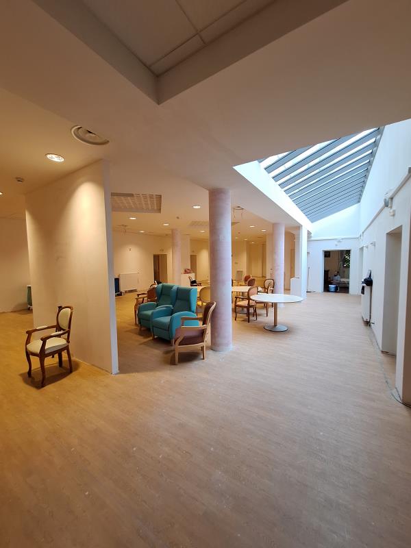 Il est 9h30, les derniers résidents de l'unité protégée arrivent au Pôle d'Activité Spécifique et Adaptée (PASA) pour passer la journée. En effet, depuis 2 petites semaines le programme paisible de l'Unité Protégée est largement bousculée par l'arrivée d'une équipe d'ouvriers pour refaire de fond en comble cet espace pour le plus grand confort de leurs habitants !
