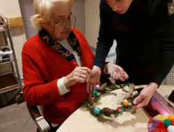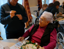 Grâce à la régularité de ces rendez-vous et une meilleure connaissance les uns des autres, résidents et jeunes sont bien détendus : anecdotes, rires et conseils circulent librement autour des tables garnies de branchages, rubans, boules colorées et paillettes.